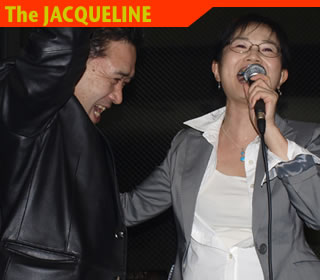 こちらは常連【The JACQUELINE】登場です。前回に引き続き『夜桜お七・デスメタルエディション(仮称)』、そして新曲はけーちゃんボーカルで『ファンキー・モンキー・ベイビー』、フィンガー5の『個人授業』の3曲でした。個人授業を意識してか、この日のジャクリーヌはちょっと女教師チック。出演者の若い男の子たちもドギマギ…してたかどうかは不明ですが。しかしなんといってもこの日のけーちゃんはノリノリでした。右の写真を見てもわかりますね。また視線が胸元に行ってるのがなんともw