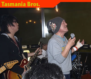 今回は単身で参戦【タスマニア・ブラザーズ】よりサカキさんです。当日アクシデントで左手を負傷、病院からそのままかけつけてくれました。ということで今回はボーカルに専念、Eのブルースをシャウトしていただきました。バックはブル・みやび・しゅくトリオと、ブルースハープに初登場ブランコ、そしてこちらも初登場のレスポール奏者カイちゃん。この彼なんとブルース大好きな17歳!「レイ・ヴォーン最高っす!」って若いのにしぶいですw。3年後には是非この店のカウンターで一緒に飲みたいですねぇ。待ってるよー!