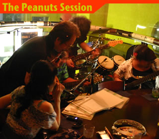 なぜか突然始まった歌謡曲セッション。きっとジャクリーヌが「歌いた〜い(はぁと」とか言ったのでしょう、えぇ多分。名曲『恋のバカンス』です。左の写真でもわかるようにみんなで歌本を囲んで演奏するという、なんともトリッキーなセッションです。なんだか間抜けな構図ですよねw。そして何故かマイクを持っているコムロトモユキ!こんな無茶ぶりにお付き合いいただき恐縮、と思いきやご本人曰く「ザ・ピーナッツは結構好き」とのこと。楽しんでいただいてなにより(・∀・)