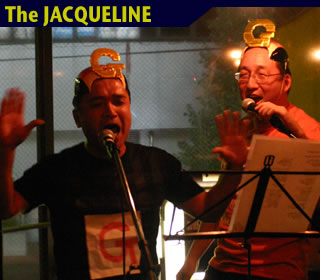 常連の色モノバンド【The JACQUELINE】登場です。今回はジャック不在につきフロントはけーちゃん&なかちゃんのオヤジコンビが大活躍!なかちゃんボーカルでB'z『EASY COME EASY GO』、サザンより『勝手にシンドバッド』、おいちゃんボーカルで矢沢永吉より『黒く塗りつぶせ』、『アイラブユーOK』、そして最後はサザンより『マンピーのG★SPOT』って感じでお贈りしました。マンピー歌う時はやはりこのハゲヅラです。しかも金色に輝く「G」付き(自作w)。この他ドラムのエミのおでこやみやびの顔などいたるところに「G」が。しっかり色モノ街道ばく進中ですね(・∀・)